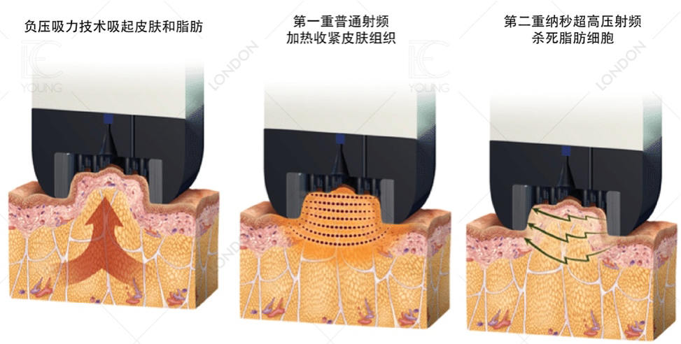 通过射频能量加热真皮层和浅层脂肪组织,刺激胶原新生,同时提升脂 肪代谢。