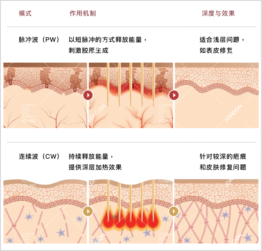 双波协同:PW脉冲波(42-45°C)针对血管病变,CW连续波(55-65°C)紧致抗衰,层次治疗更全面。