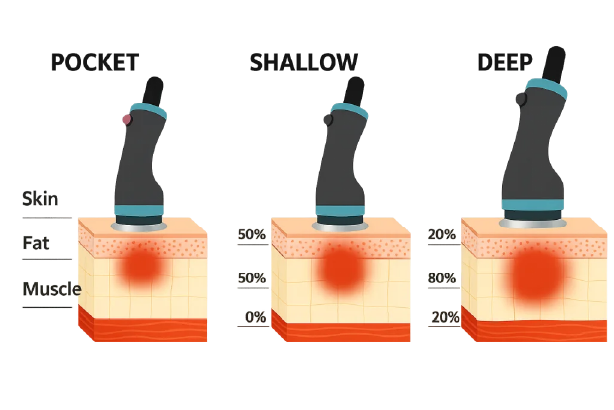 With Deep, Shallow and Pocket handpiece, the system can treat multiple tissue depths simultaneously, providing comprehensive improvements from superficial skin tightening to deeper fat reshaping.