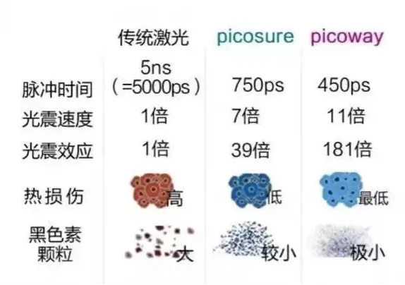 通常的皮秒项目脉冲时间在300ps-750ps的范围内,但是PicoWay®超皮秒最短波长脉宽可达到250ps ,是目前皮秒激光中最短的。脉宽越短,脉冲持续时间越短,激光的瞬间爆破力越大,可以以瞬间的爆 破力击碎任意大小的色素团,且不会让热效应扩散到周围组织,从而大幅提升代谢效率,降低反黑几率 ,尤其适合黄皮、敏感肌和浅色斑人群。