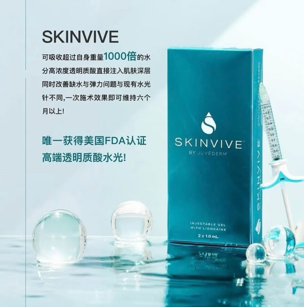 与传统填充的区别:传统填充侧重于增加容量和减少皱纹,而SKINVIVE™旨在通过增加水分来改善皮肤质量。与肉毒杆菌素区别:肉毒杆菌素用于减少皱纹和肌肉收缩,而SKINVIVE™专注于皮肤深层保湿。
