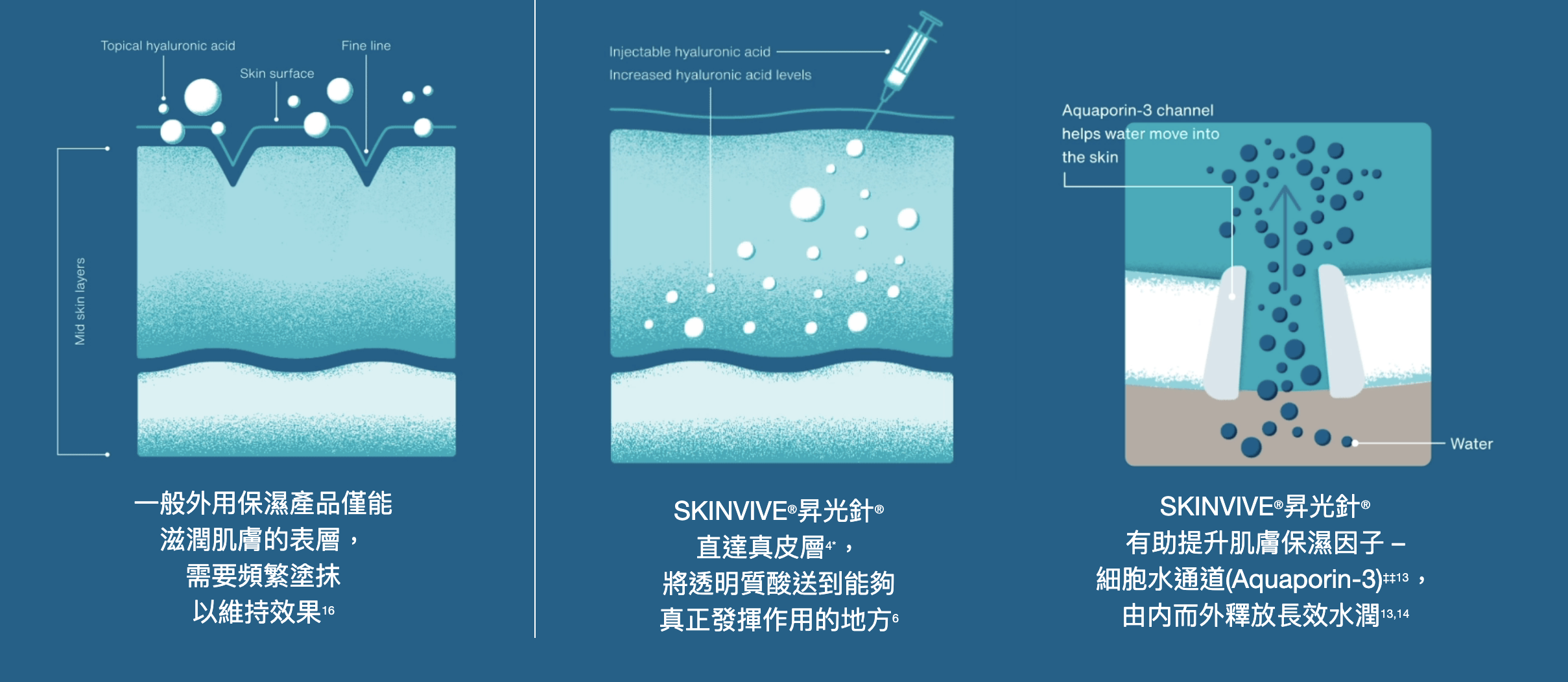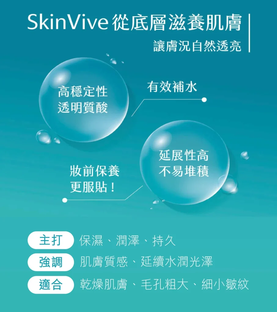 SKINVIVE®适合所有肌肤类型。一次疗程即可提供深层,持久的补湿效果,可持续达9个月,更可抚平明显细纹,令肌肤变得更清透、顺滑、水润及有光泽。